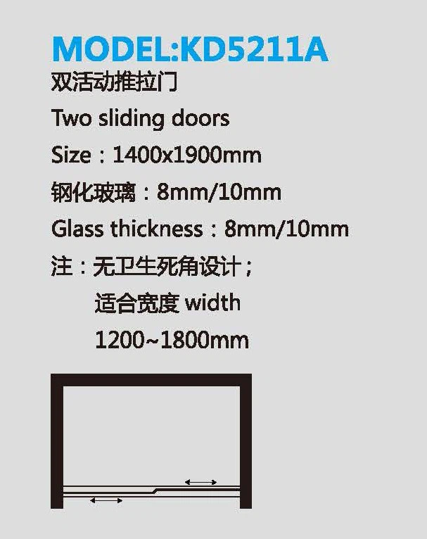 Modellnummer: KD5211 Panelmaterial: Temperiertes Glas Glasdicke: 8 mm/10 mm Offener Stil: Schieben Angepasst: erlaubt Standard für Temperedglas Zertifizierung Standard: DIN EN 12150, AS/NZS 2208: 1996, ANSI Z97. 1-2004, BS6206